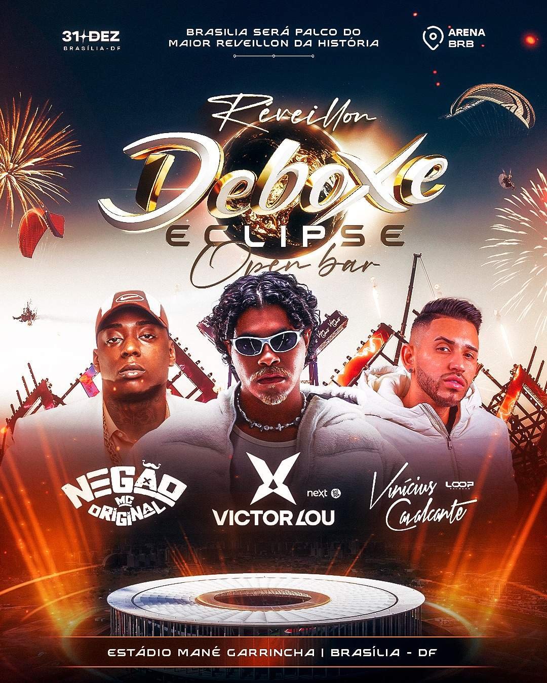 O réveillon mais exclusivo de Brasília chega à Arena BRB, no Mané Garrincha, com uma estrutura imponente, conceito premium e uma experiência inesquecível para celebrar a virada do ano.